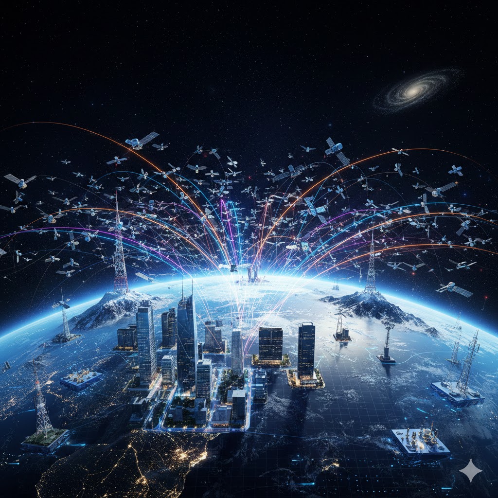우주 공간에 떠 있는 저궤도 위성들이 지상의 복잡한 도시 네트워크와 실시간으로 소통하며, 경계 없는 연결을 구현하는 장면이 담겨 있어요.