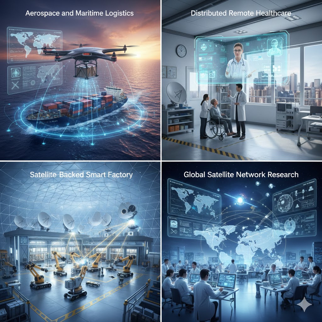 위성 통신망을 통해 선박과 드론이 실시간으로 연결되어, 지연 없는 통합 관제가 이루어지는 스마트 물류의 미래를 보여줘요.