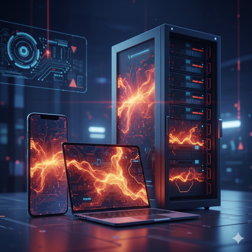 하단 좌측: 밀집된 데이터 센터 서버에서 발생하는 열기와 이를 관리하기 위한 공조 시스템의 중요성을 보여줍니다.