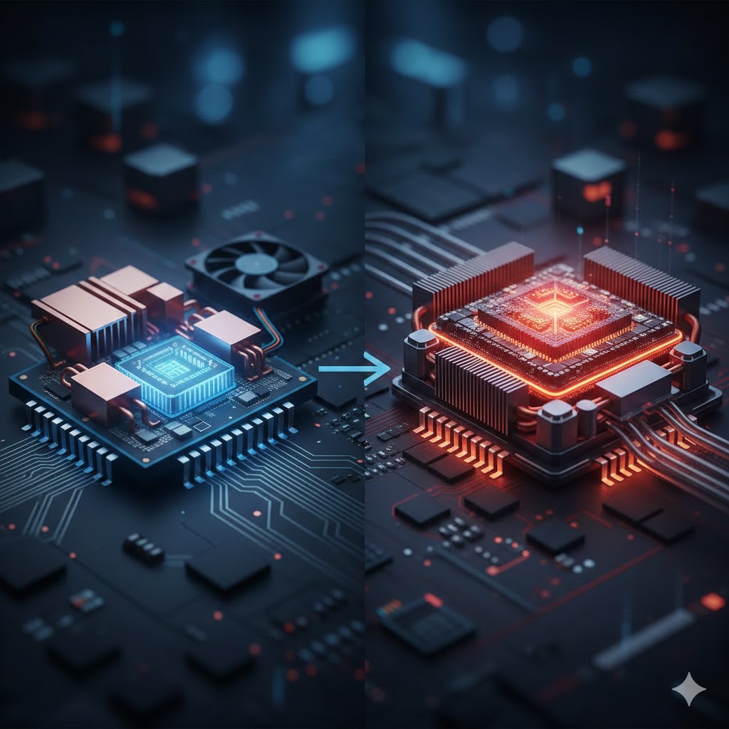 오른쪽은 촘촘한 고집적 회로 위로 강력한 다중 냉각 시스템이 결합된 현대의 설계를 보여줍니다.