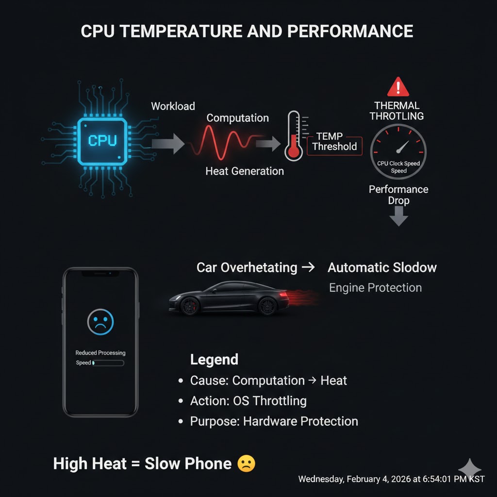 CPU가 뜨거워질수록 쓰로틀링이 작동해 처리 속도를 낮추고, 이 과정에서 우리는 “느려짐”을 체감합니다.