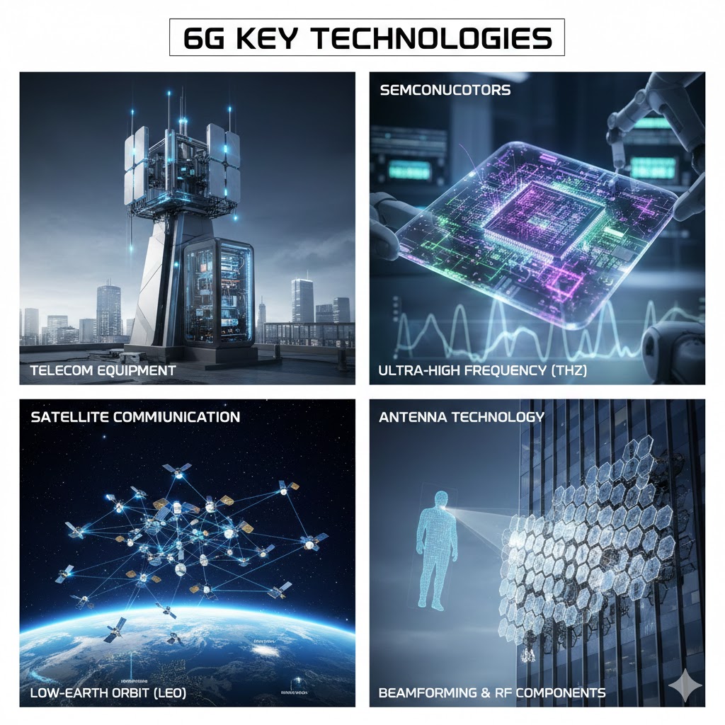 고성능 기지국 장비부터 테라헤르츠 대역을 처리하는 초정밀 반도체, 지구 전역을 연결하는 저궤도 위성망, 그리고 신호 효율을 극대화하는 지능형 안테나 시스템까지 각 분야의 유기적인 결합을 시각화하여 표현하였습니다.