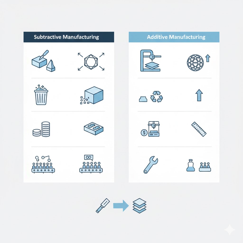 기존 절삭가공과 비교하면 형상 자유도와 소재 효율에서 큰 차이가 있습니다.