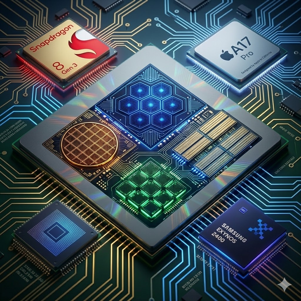중앙의 대형 칩셋은 CPU, GPU, NPU 등 다양한 연산 유닛이 하나의 SoC(System on Chip)로 통합되어, 유기적으로 작동하는 설계를 정교하게 보여줍니다.