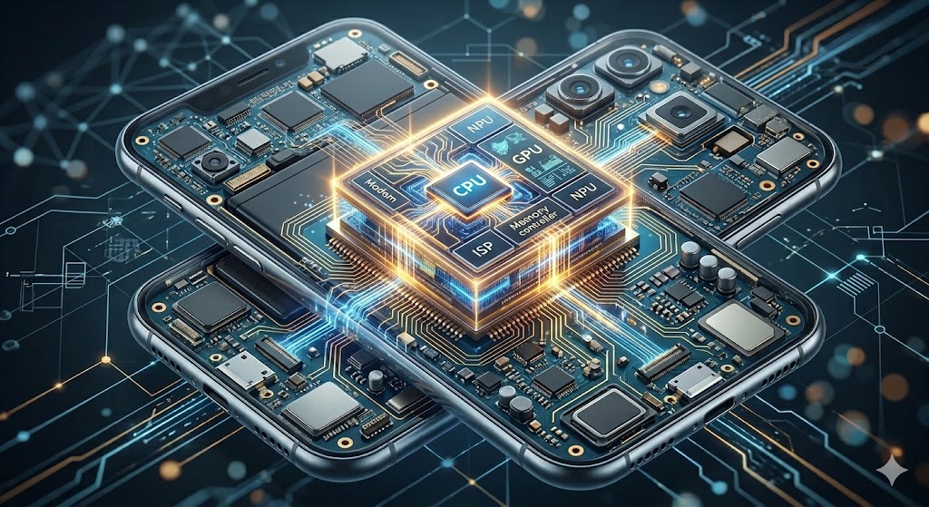 그 안에는 CPU 코어(연산 담당), GPU(그래픽 처리), NPU(인공지능 연산), ISP(카메라 신호 처리), 메모리 컨트롤러가 함께 들어 있다.