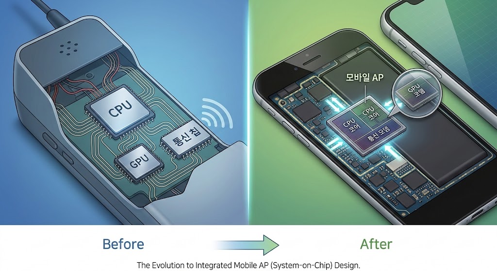 좌측에는 CPU, GPU, 통신 칩이 멀리 떨어져 복잡한 배선으로 연결된 과거의 구조를, 우측에는 하나의 칩(SoC) 내부에 이 모든 기능이 집약되어 효율을 극대화한 현대적 구조를 보여주며 기술적 진보를 강조합니다.