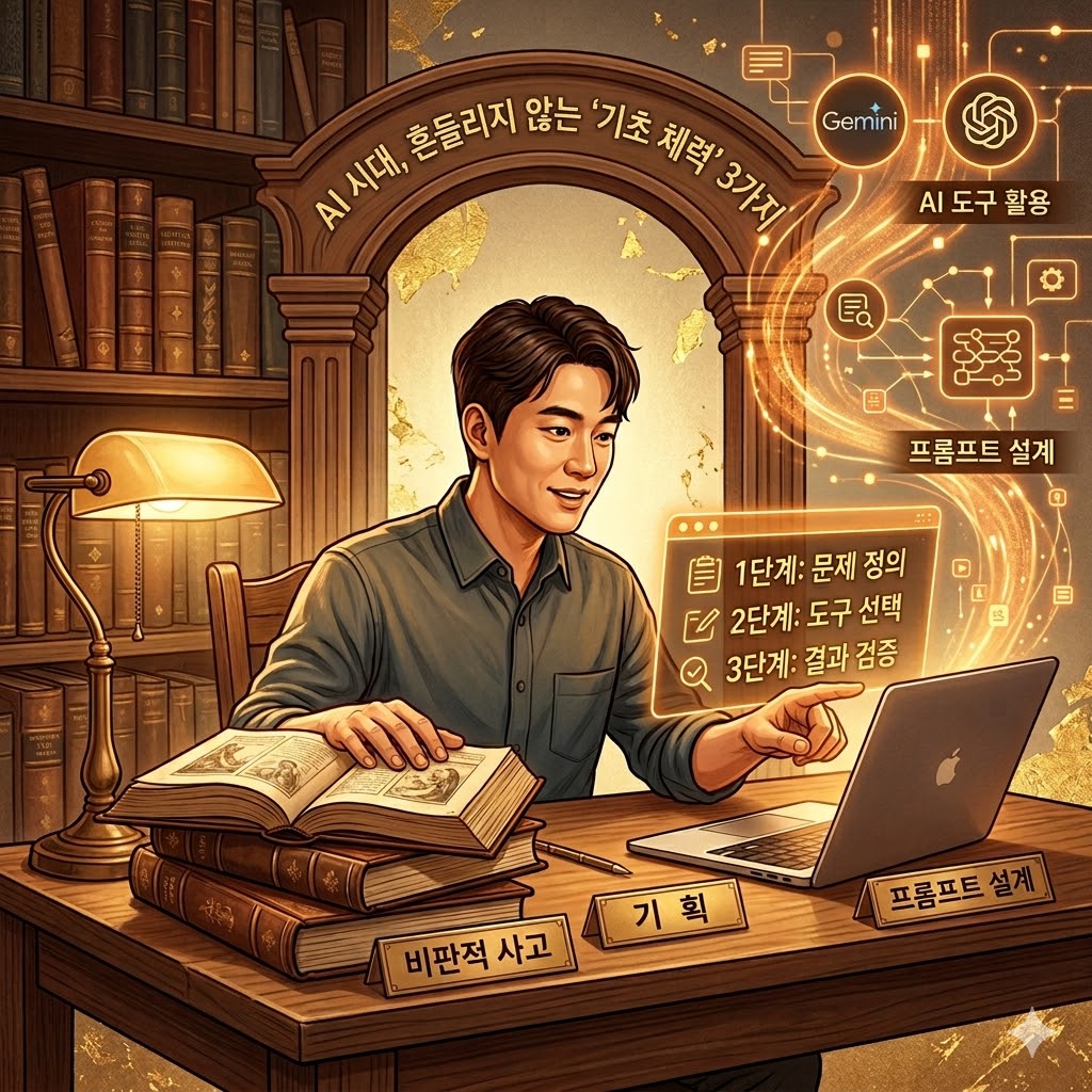 특히, 상단의 **"AI 시대, 흔들리지 않는 '기초 체력' 3가지"**라는 문구는 기술의 홍수 속에서 우리가 견지해야 할 본질적인 방향성을 명확히 제시합니다.