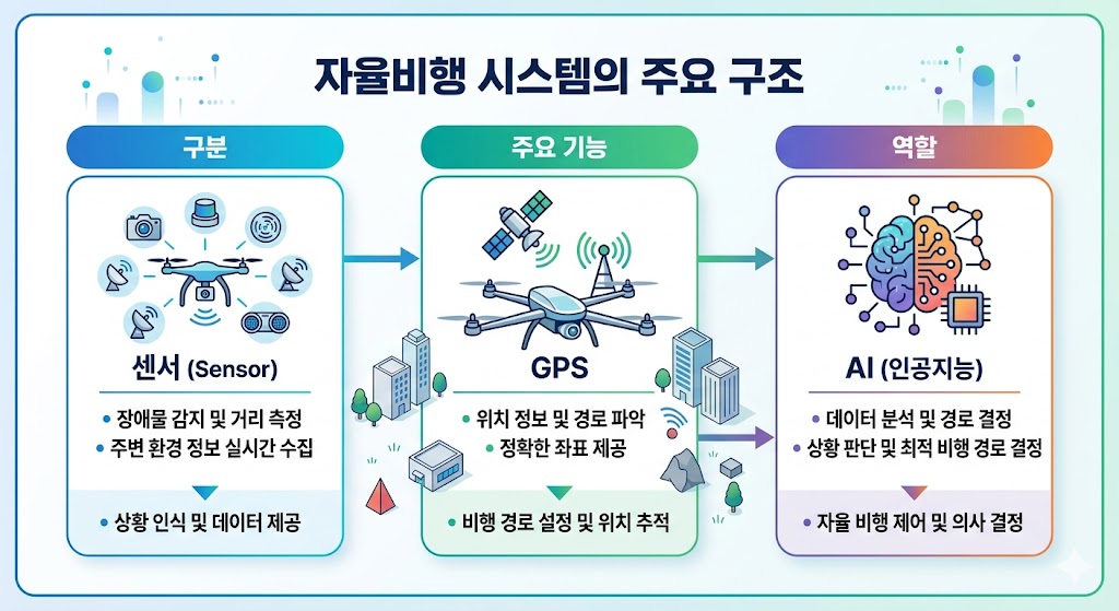 자율비행 드론은 크게 센서, GPS, 그리고 AI라는 세 가지 핵심 요소가 유기적으로 결합하여 작동합니다.