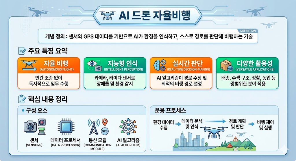 AI 드론 자율비행 기술은 센서와 GPS 데이터를 활용하여 드론 스스로 환경을 인식하고, 경로를 결정하는 최첨단 기술입니다.